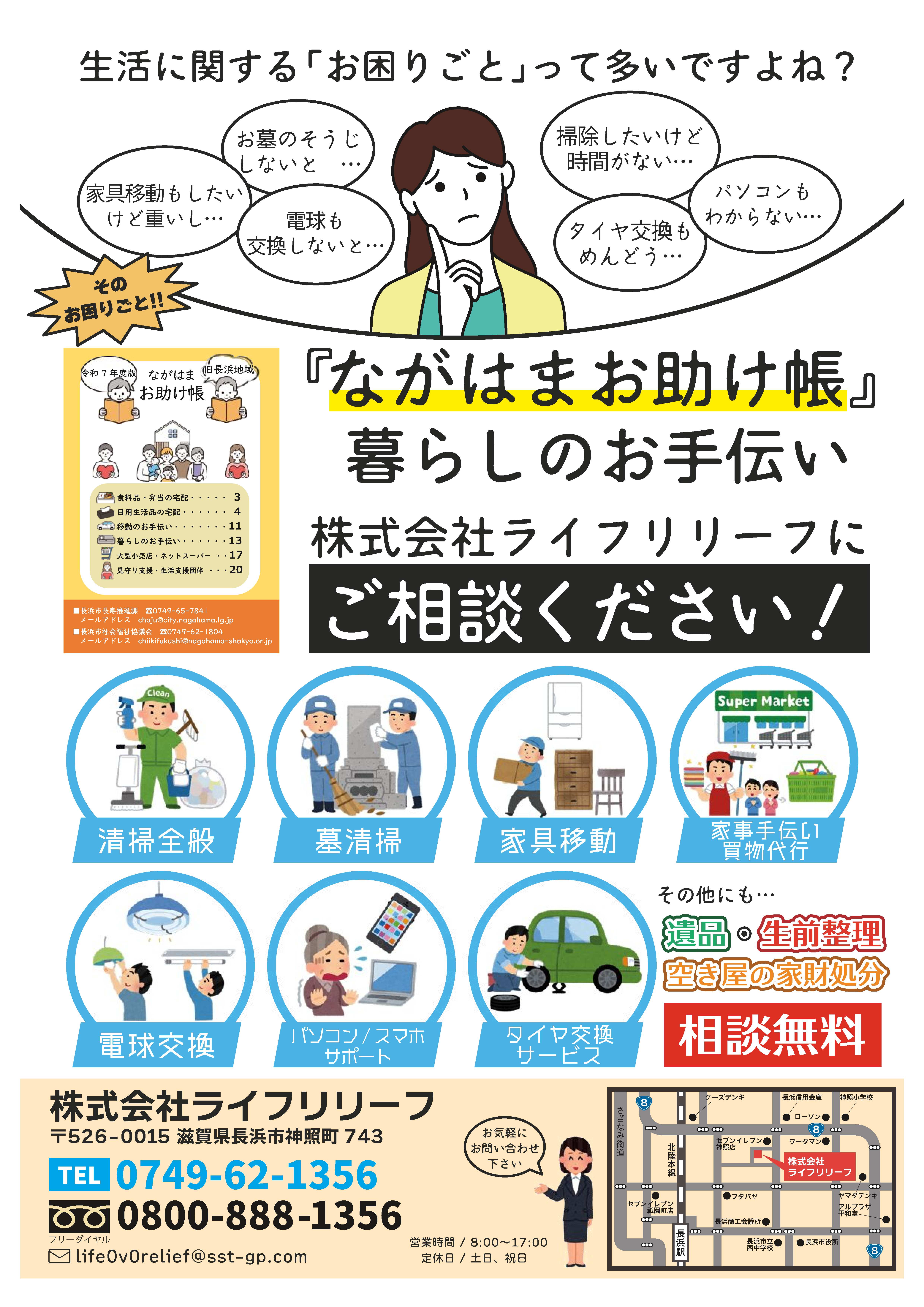 長浜お助け帳 チラシ1 2026.02.26 お問い合わせ お気軽にお電話ください 〒526-0015滋賀県長浜市神照町743番地TEL:0749-62-1356FAX:0749-65-0547Mail:life0v0relief@sst-gp.com
